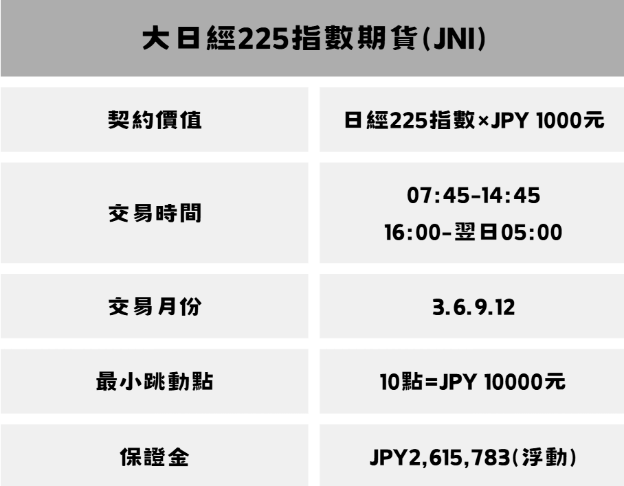 大日經期貨合約規格(JNI)、交易時間、保證金