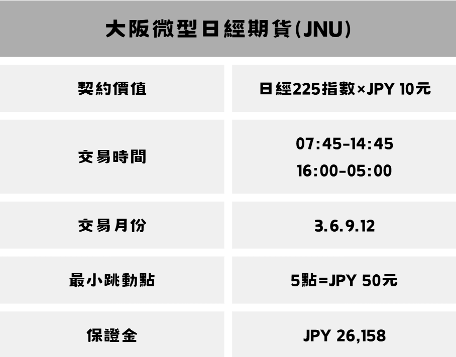 微型日經期貨合約規格(JNU)、交易時間、保證金